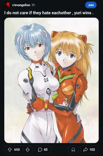 tgirlschierke@lemmy.blahaj.zoneEnglish · 21 hours agoAsurei's Strongest Soldier [Neon Genesis Evangelion]lemmy.blahaj.zoneimagemessage-square2linkfedilinkarrow-up155arrow-down13