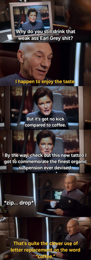 That last frame was a great expression for Mr Pickerd. I like to think Janeway would totally be that crass lmao!