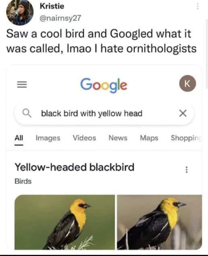 minus-squarepjwestin@lemmy.worldlinkfedilinkEnglisharrow-up15·3 months agoBird names are all either, “red-breasted blackbird,” or, “deep-throated cum-tit.” There’s no in-between.