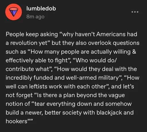 We’re not worried about missiles, stealth aircraft, armor penetrating rounds, their stupid microwave cannons, drone strikes or whatever other sci-fi bullshit looks good on television. We’re worried about armored vehicles rolling down mainstreet while there are thousands of people there, and the crowd crush that results. We’re worried about one zealous national guardsman with an M2 firing blindly into a march as it crosses a bridge. We’re worried about any leaders that emerge being quietly disappeared overnight, about our families being singled out by a teen at a fusion center that’s watching Joe Rogan on their phone, or about the simple fact that the military could just turn off critical infrastructure and our cities would grind to a halt. We have no way to stop that.