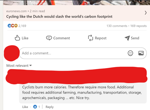 He ignored grey energy in the car and bike production, which would make the bike look way better. Whenever he’s railing against EVs he includes grey energy because then it makes traditional cars look better.