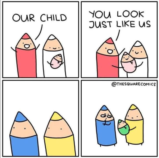 The blue pencil father suspects infidelity seeing the green baby, but green is actually the correct result of blue + yellow. He’s wrong about cheating because he doesn’t understand basic color theory.