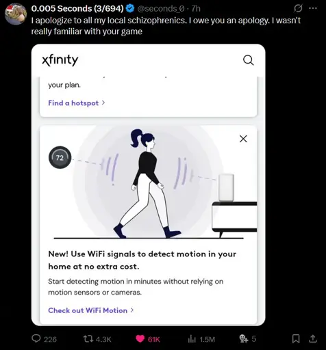 @gravitas_deficiency@sh.itjust.works @nebula42@lemmy.zip If a neighbor has this thing, it doesn’t matter if your router is yours, because theirs will still “infiltrate” (and see as well, as I’ll say below) your house as microwave-length (both the 2.4GHz and the 5GHz) electromagnetic waves can and will trespass the walls separating the two…