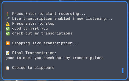 I’m not familiar with whisper.c++ but I did try faster-whisper. Unfortunately, the transcriptions took upward of 40sec and it didn’t offer live transcription, which is a nice feature of vosk. There’s a comparison in the readme with other differences. That said, it should be relatively modular. It shouldn’t take much to swap it back to whisper if that’s what you prefer to use. Whisper is in the nix flake as optional, and the program allows you to change models but i haven’t bothered trying to switch back to Whisper since Vosk has been more performant.