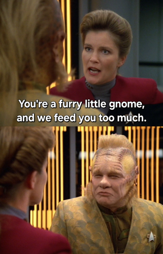 Yeah, Neelix has a lot of annoying times (and creepy in the case of Kes) but I definitely like him as the guy who’s smiling because he’s seen some truly terrible shit and just wants the people around him to feel comfortable in their situations. Neelix was written so many different ways in Voyager, it’s hard to totally like or dislike him.