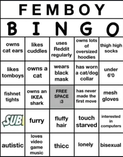 Zyratoxx@fedia.io to 196@lemmy.blahaj.zone · 26 days agoBingo rulefedia.ioimagemessage-square25linkfedilinkarrow-up1127arrow-down14