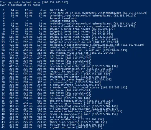 Linux:traceroute bad.horse -m 64 --resolve-hostnames