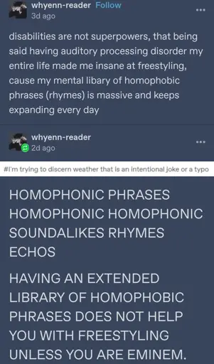 Not a huge Eminem fan so I might be wrong but afaik he’s got some homophobic lyrics but he’s not actually homophobic. At least I remember Elton John defending him and calling him a friend and telling a story about Eminem buying cock rings for him and his husband or something.