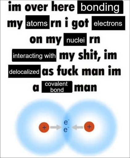minus-squareShinkanTrain@lemmy.mllinkfedilinkEnglisharrow-up6·2 days agoIn the sigma bond, straight up overlapping it. And by “it” haha let’s hust say, my orbits