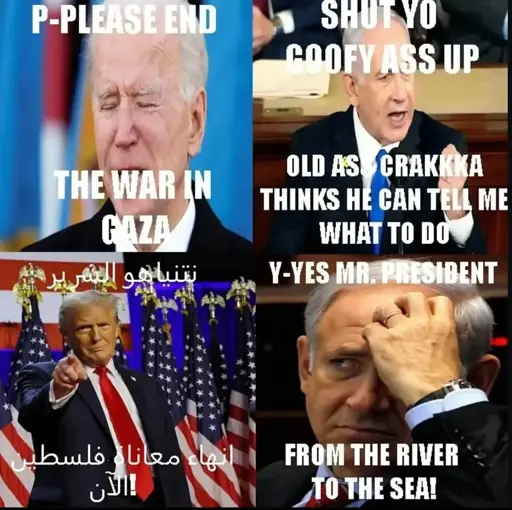 from my limited knowledge of the arabic script I can read “netanyahu” and “palestine” but not the rest, anybody help?