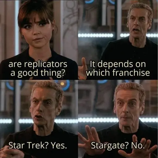 That’s a good point. It’s not replicating unless you’re telling it to make a copy of something that already exists (you wouldn’t replicate a car…). Great, now I have another commonly used Star Trek word to be annoyed about! Although it is on-brand for humans to have named replicators incorrectly. We operate more on vibes than anything else and do stuff like that a lot. My biggest pet peeve, and not only Star Trek is guilty of this, is using “sentience” to mean “sapience.” All animals are sentient - they can sense the word around them. It’s in the name!
