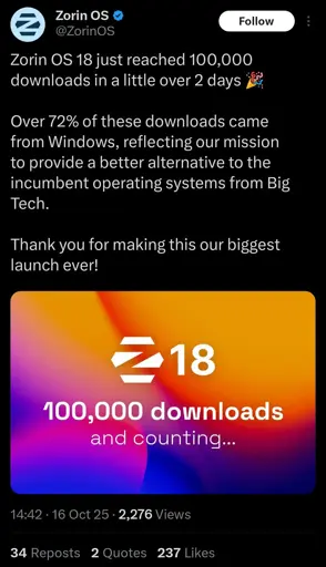 I’ve never used Zorin. It doesn’t seem to match my preferences and needs. Regardless, anyone switching from Windows [and Mac] to any Linux distro is fantastic for all of us, including remaining Windows users (probably not Mac users though).
