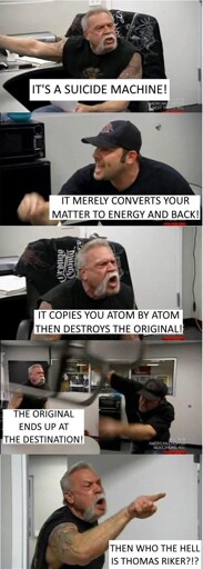 minus-squareMalikMuaddibSoong@startrek.websitelinkfedilinkEnglisharrow-up9·13 days agoSince Picard 3 it’s canon that the transporter is a meat printer that relies on cached DNA to do shallow copies. Hacking that cache was the big plot reveal of how the borg-changelings infiltrated starfleet.