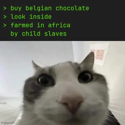 minus-squareIgnotum@lemmy.worldlinkfedilinkEnglisharrow-up22arrow-down1·2 months agoYeqh like when nestle launched a premium version with no slave labour, they didn’t have less slavery overall they just used more slavery-produced chocolate in their other products
