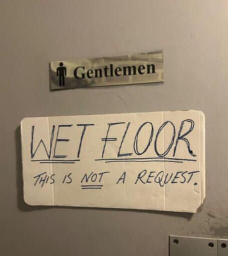 Anytime I’d ever been in a bathroom that read “gentlemen” it has always been the filthiest, most uncomfortable, piss smelling, rotten mortar, musky, dank, humid bathroom with lead everything, no privacy, and no space. Like a truck stop in a library’s hidden service basement where all the touchy old men leak on a pile of moldy rags in the corner, never wash their hands, and nothing ever gets cleaned. It doesn’t seem natural to be able to stain tile. Literally, seeing that sign gives me the cringeshiversyuck and I’m glad I never have to use one of those again.