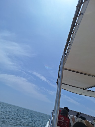 For background, I was on a tour coming back from Ballestas Islands just off of Peru, around 11:00 a.m., no rain (it’s a desert area), sky was partly cloudy. The phenomenon stayed a couple of minutes. As we progressed, the colours merged to a strand of amber.