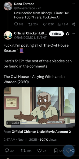 LiamBox@lemmy.ml to Piracy: ꜱᴀɪʟ ᴛʜᴇ ʜɪɢʜ ꜱᴇᴀꜱ@lemmy.dbzer0.comEnglish · 2 months ago'The Owl House’ creator Dana Terrace situation with Disney+ positive views on AI generated contentlemmy.mlimagemessage-square35linkfedilinkarrow-up1429arrow-down14cross-posted to: fuck_ai@lemmy.world