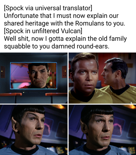 This…might be canon now. There’s a few conversations in Strange New Worlds that feel like the Universal Translator reached its limit of making Vulcans not-rude.