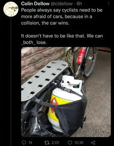 The pool noodle is good, but I dunno if I’d want to bike with a stick poking out from my bike towards cars. Can you pit maneuver a bike? Because it seems like the stick would make it more vulnerable to that.