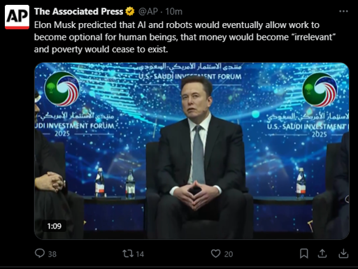 Elon Musk predicted that AI and robots would eventually allow work to become optional for human beings, that money would become “irrelevant” and poverty would cease to exist.