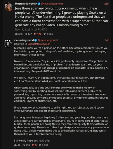 arrow-up11.05Karrow-down1imageThe CEO of Microsoft AI is unimpressed by the negative criticism of Windows AI.lemmy.nzLee Duna@lemmy.nz to Fuck AI@lemmy.worldEnglish · 7 days agomessage-square78linkfedilink