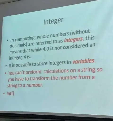 You can very much perform calculations on strings, and its a very cool thing, but i think thats wayyy above the level that this presentation is meant for cause you probably should know what integers are before that, even outside of programming…