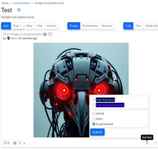 In PieFed v1.4 it will be possible to label posts as having AI generated content. Labelled posts will get a little badge near their title, similar to how nsfw and nsfl content is labelled. Mods and authors can change this value on a post in the same way they do flair and nsfw, using the little tags button in the bottom right or in ‘More options’ when editing their post.