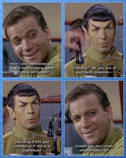 So spock could be exceptionally irritated right now (especially since this is pre-kolinahr for him) but he won’t show it.