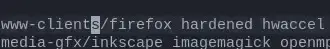 system-pipewire.* www-client/firefox Available versions: (esr) 140.6.0^t (rapid) ~146.0^t ~146.0.1^t {+X +clang dbus debug eme-free +gmp-autoupdate gnome-shell hardened hwaccel jack jpegxl +jumbo-build libproxy openh264 pgo pulseaudio selinux sndio +system-av1 +system-harfbuzz +system-icu +system-jpeg +system-libevent +system-libvpx system-pipewire system-png +system-webp +telemetry test valgrind wasm-sandbox wayland wifi L10N="ach af an ar ast az be bg bn br bs ca ca-valencia cak cs cy da de dsb el en-CA en-GB eo es-AR es-CL es-ES es-MX et eu fa ff fi fr fur fy ga gd gl gn gu he hi hr hsb hu hy ia id is it ja ka kab kk km kn ko lij lt lv mk mr ms my nb ne nl nn oc pa pl pt-BR pt-PT rm ro ru sc sco si sk skr sl son sq sr sv szl ta te th tl tr trs uk ur uz vi xh zh-CN zh-TW" LLVM_SLOT="19 20 +21"} Homepage: https://www.firefox.com/ Description: Firefox Web BrowserAnd not many packages do.