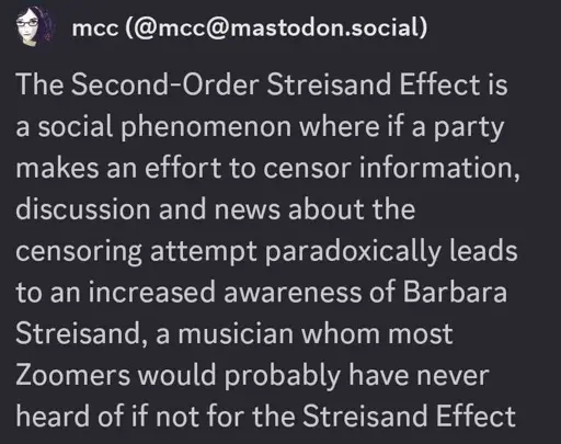 The Third Order Streisand Effect is when someone reacts to the second order one by posting this Duck Sauce banger