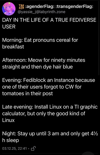 Samskara@sh.itjust.works to Fediverse memes@feddit.ukEnglish · 1 month agoDay in the Life of a True Fediverse Usersh.itjust.worksimagemessage-square124linkfedilinkarrow-up1668arrow-down134