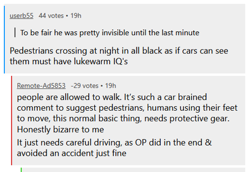 Didn’t really expect much from DrivingUk but honestly the amount of downvotes shocked me. God forbid people go out at night dressed normally without full on high vis.