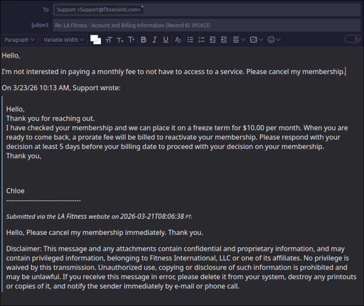 northernlights@lemmy.today to Mildly Infuriating@lemmy.worldEnglish · 21 days agoAsked LA Fitness to cancel my membership, they offered to freeze it for $10/month insteadlemmy.todayimagemessage-square182linkfedilinkarrow-up1815arrow-down17file-text