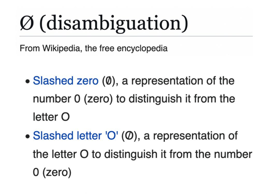 Empty set is ∅, slashed zero is 0︀ (if your browser decides to render the unicode variant) or 0︀ in html