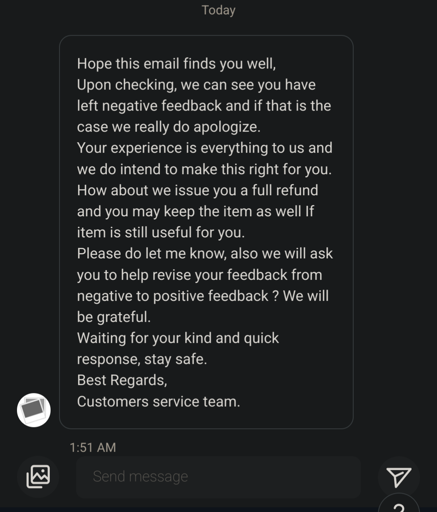 This happened to me once but diff platform. I gave the seller 3 out of 5 stars. Seller messaged me with the same m.o. I changed the stars to 1 and attach the screenshot. Fuck them.