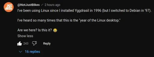 - Type: Comment. Author: “@NotJustBikes”. Publisher: [Type: Video. Title: “I installed Linux (so should you)”. Author: “PewDiePie”. Publisher: “YouTube”. Published: 2025-04-26T21:29:28Z. URI: https://www.youtube.com/watch?v=pVI_smLgTY0.]. Published: 2025-04-27 00:31:21Z. Accessed: 2025-04-27T05:44Z. URI: https://www.youtube.com/watch?v=pVI_smLgTY0&lc=UgxdrNd-2ttDs897n014AaABAg.
