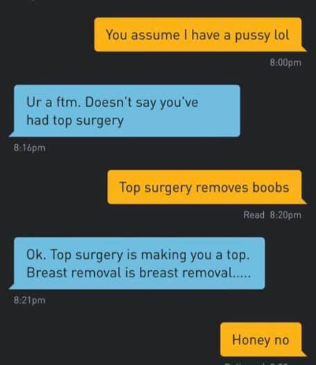 minus-squareAtelopus-zeteki@fedia.iolinkfedilinkarrow-up77·6 months agoAfter top surgery you can spin, like forever!