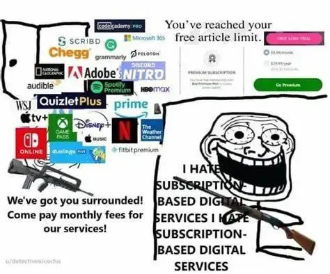 I can see how subscriptions are very helpful to handling expenses on the business side especially for any program that operates in a way that security updates are important. But far too many companies have set the price way to high and hid it with a short time so it looks cheap. If yearly was the default length and was reasonably priced then I would be fine with them but $5 a month for a lot of things that could easily be $5 a year is too much.