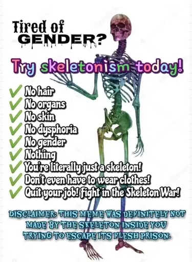 transcription: tired of gender? try skeletonism today! no hair, no organs, no skin, no dysphoria, no gender, nothing, your literally just a skeleton, dont even have to wear clothes, quit your job, fight in the skeleton war! disclaimer: this meme was definitely not made my the skeleton inside you trying to escape its flesh prison.